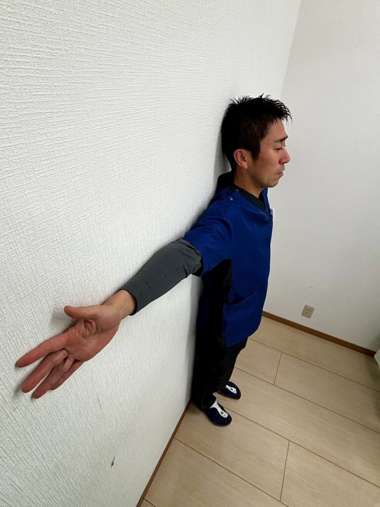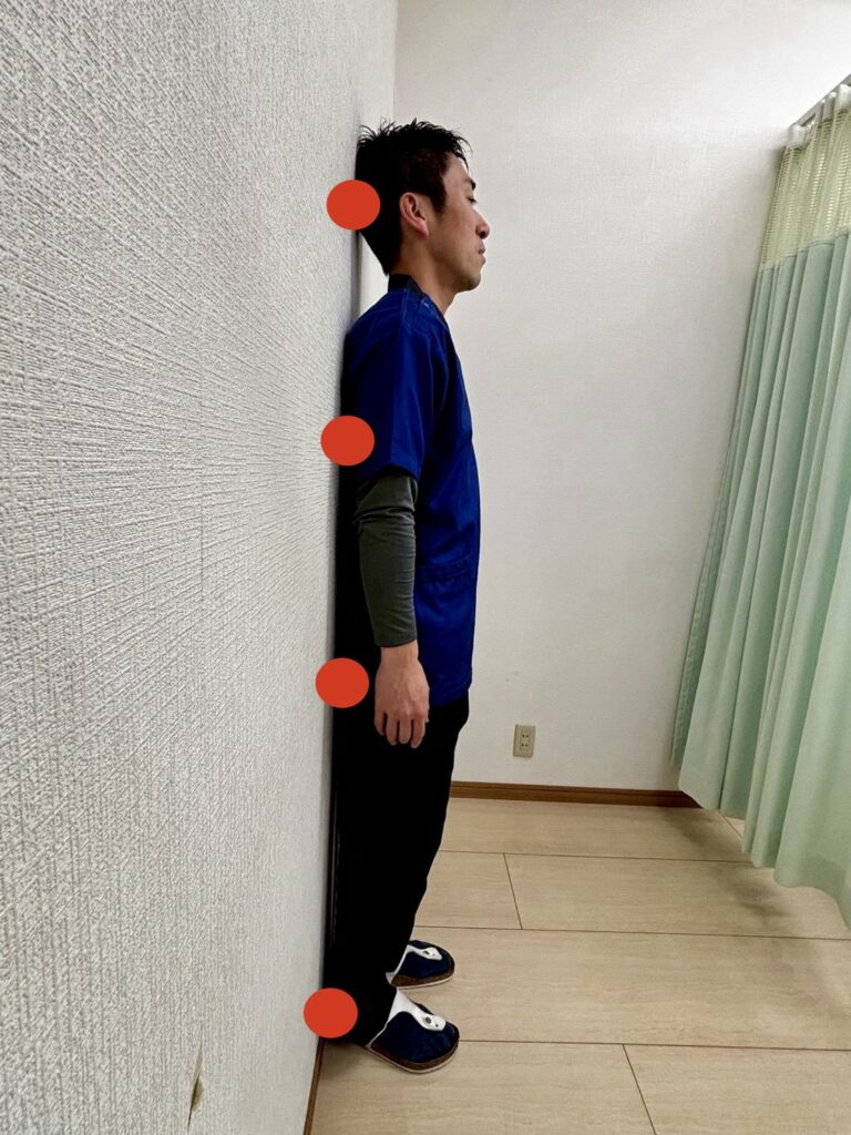 壁に背中をつけて立ちます(かかと、お尻、肩甲骨を壁につけます)。